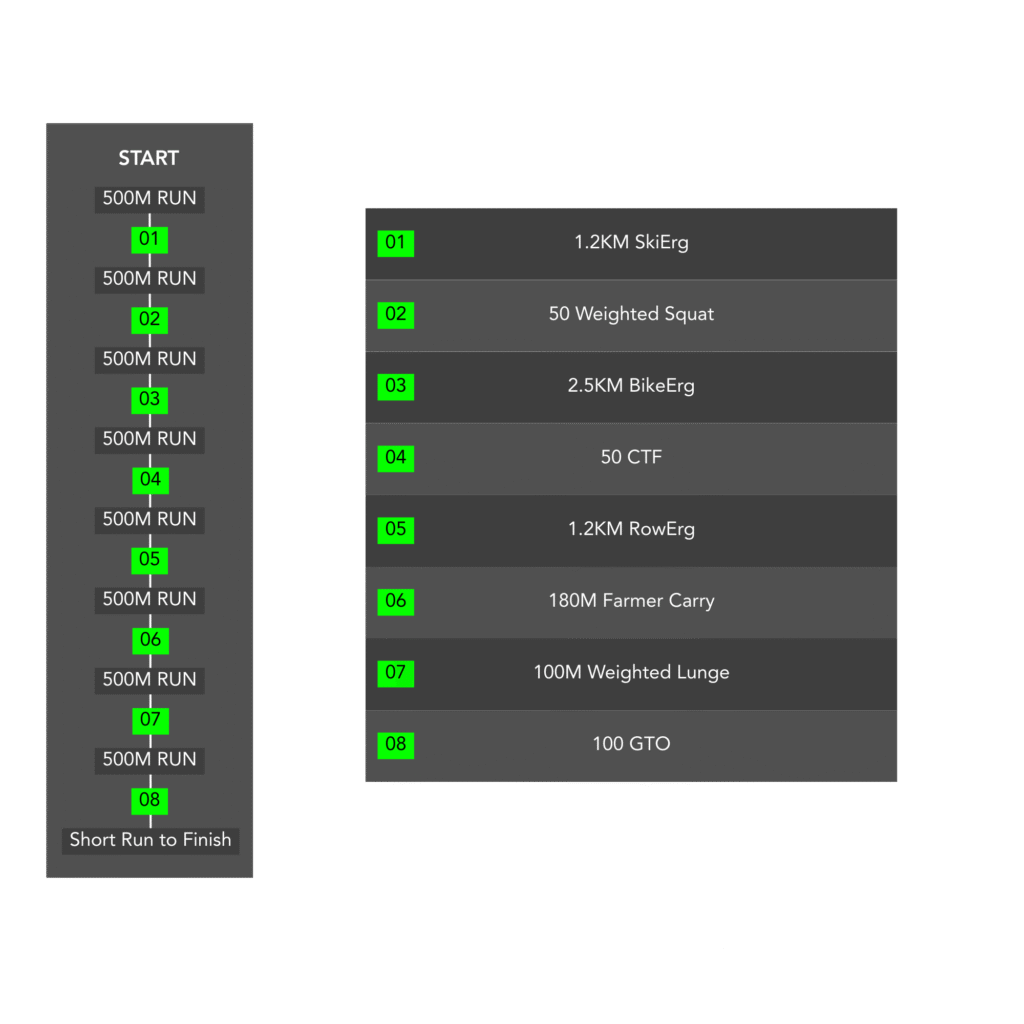 This page breaks down how the event works so visitors can quickly understand the structure. It explains each station, the running segments, and how the full workout flows from start to finish, giving a clear view of what the athlete takes on during every race.